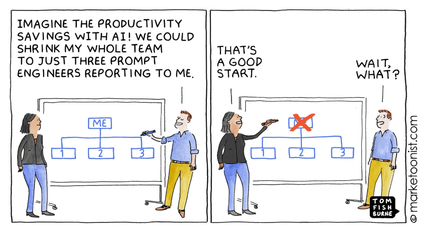 If these companies miscalculate their ability to grow without more hands on deck, they’re in for a world of hurt. They’ll experience burnout of existing (human) staff, low morale, and a nosedive in productivity. And if the anticipated growth doesn’t materialize, they might find themselves scrambling to reduce headcount further while dealing with a tarnished reputation. Then there’s the fact that leaning heavily into AI will require a complex and lengthy project of restructuring existing jobs, something that shouldn’t be underestimated.