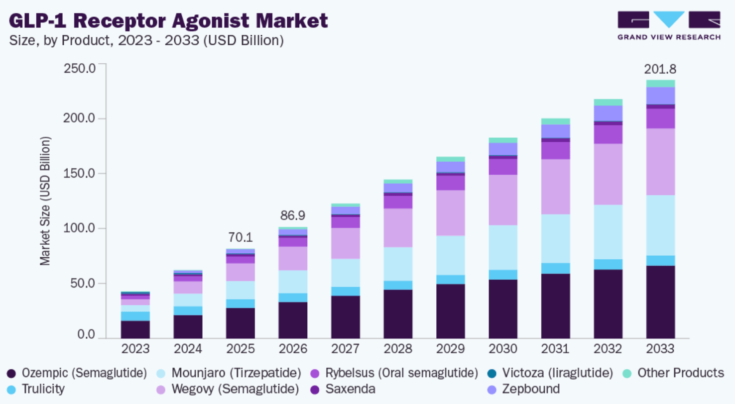 Looking ahead, growth accelerates. Oral pills launched in late 2025 (e.g., Wegovy pill at $149-$299 per month), price cuts via government deals (as low as $245 per month for eligible patients), and the potential for once-a-year injections could push adoption to 50-75% of U.S. adults in 10 years.